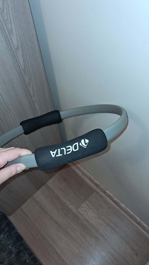 Delta baskılı gri pilates çemberi, egzersizlerde tutuş için siyah yastıklı rahat tasarıma sahiptir. Esneklik ve güç artırmak için uygundur.