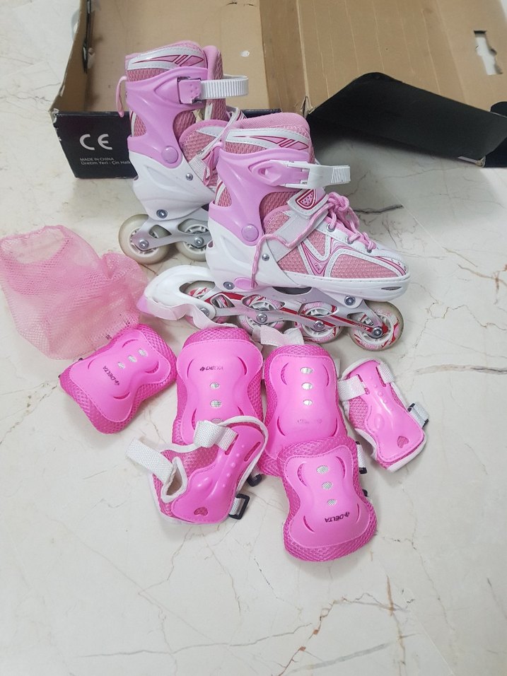 Açık pembe renkli, bağcıklı ve baskılı detaylara sahip aliminyum kız çocuk ayarlanabilir paten. Spor ve sokak stili için uyumlu koruyucu ekipmanlarla birlikte.mandalında hafif bir kırığı var ama kapanmasına engel değil.#kızçocukpaten#delta#koruyucuekipman#31-34numara#