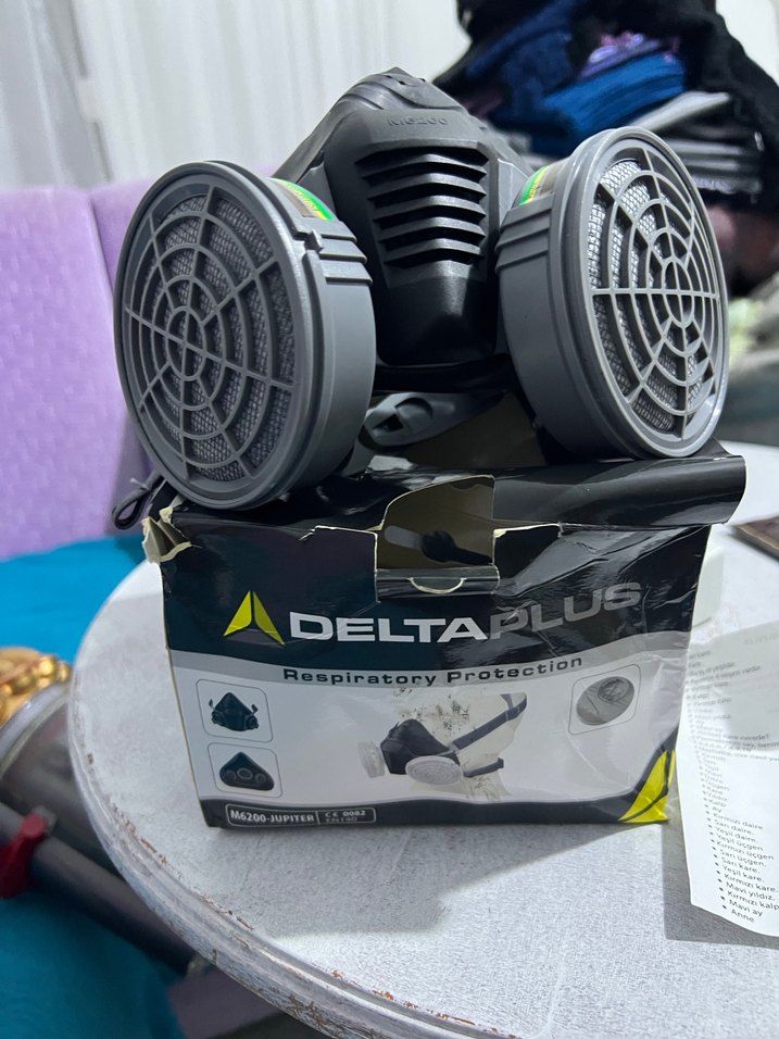 Delta Plus gri koruyucu maske, çift filtreli solunum koruması sağlar. Çeşitli ortamlar için güvenlik ve konfor sunar. ️
