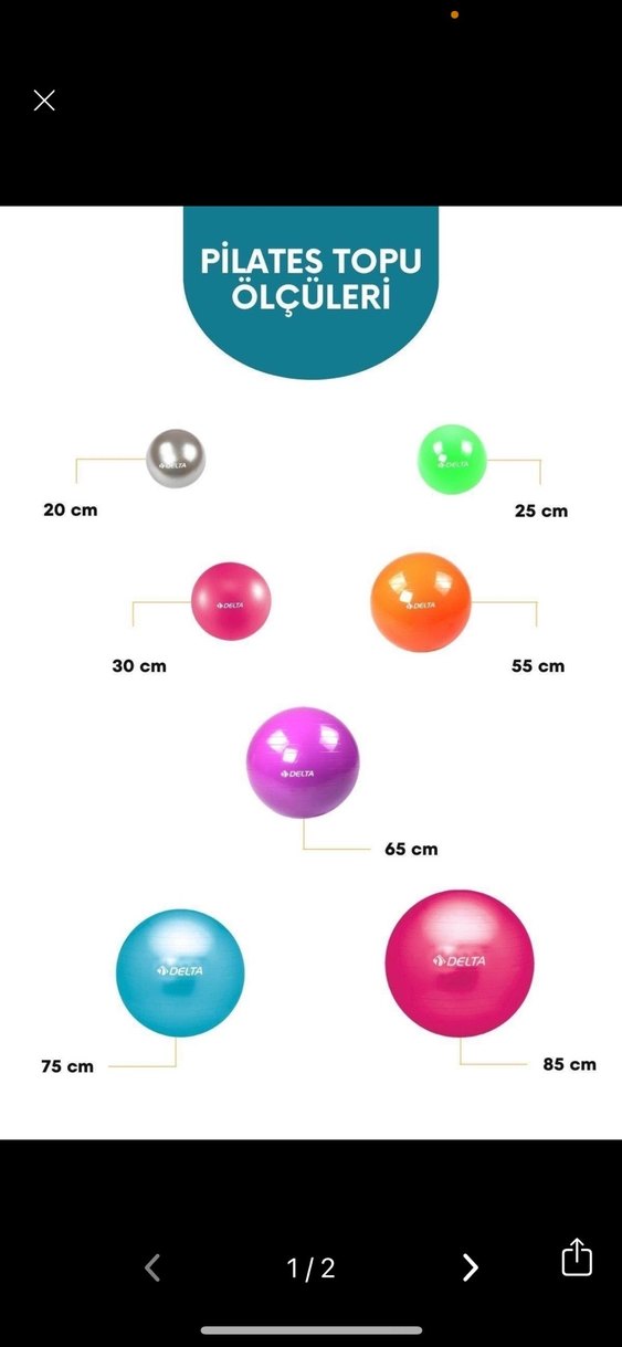 Delta pilates topları 20 cm'den 85 cm'ye kadar farklı boylarda, canlı renklerde ve puantiyeli desenlerle sunulur. Egzersiz için uygundur.