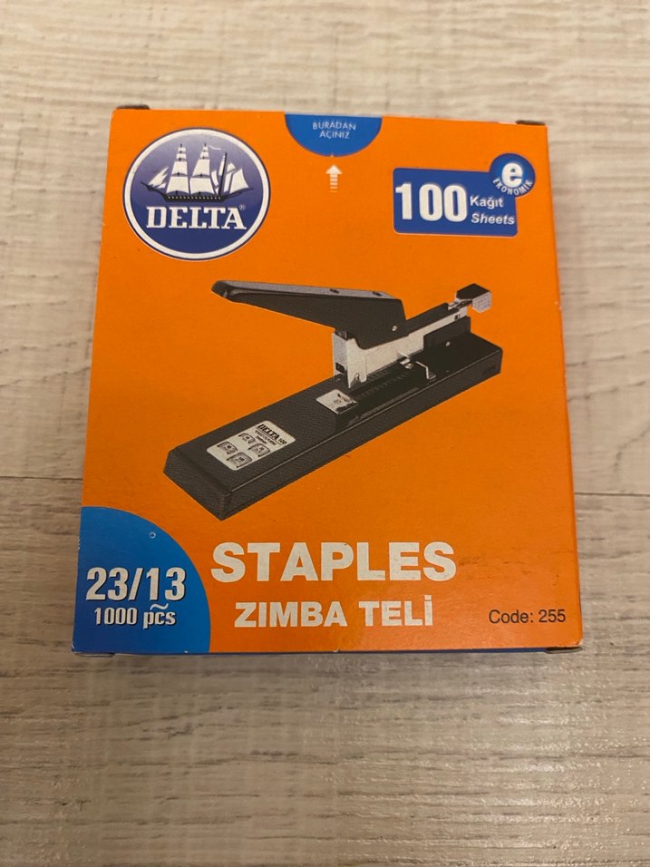 Delta markalı siyah 23/13 boyutunda, 100 sayfaya kadar zımba teli. 1000 adet, kod 255. Dayanıklı ve güvenilir masaüstü aksesuarı.