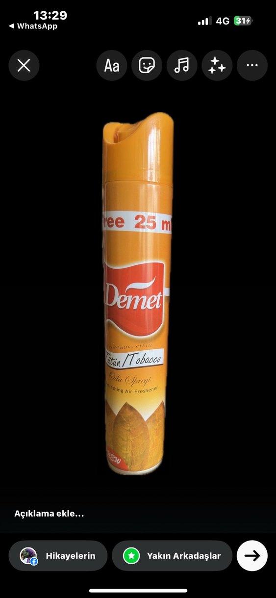 Demet tütün kokulu oda spreyi, Net 425 ml boyutunda, iç mekanları ferahlatmak için kullanılır.