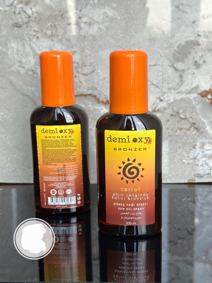Demioxy Carrot bronzlaştırıcı güneş yağı spreyi, havuç özü ve E vitamini içerir. 200 ml şişede, turuncu kapaklıdır. ☀️