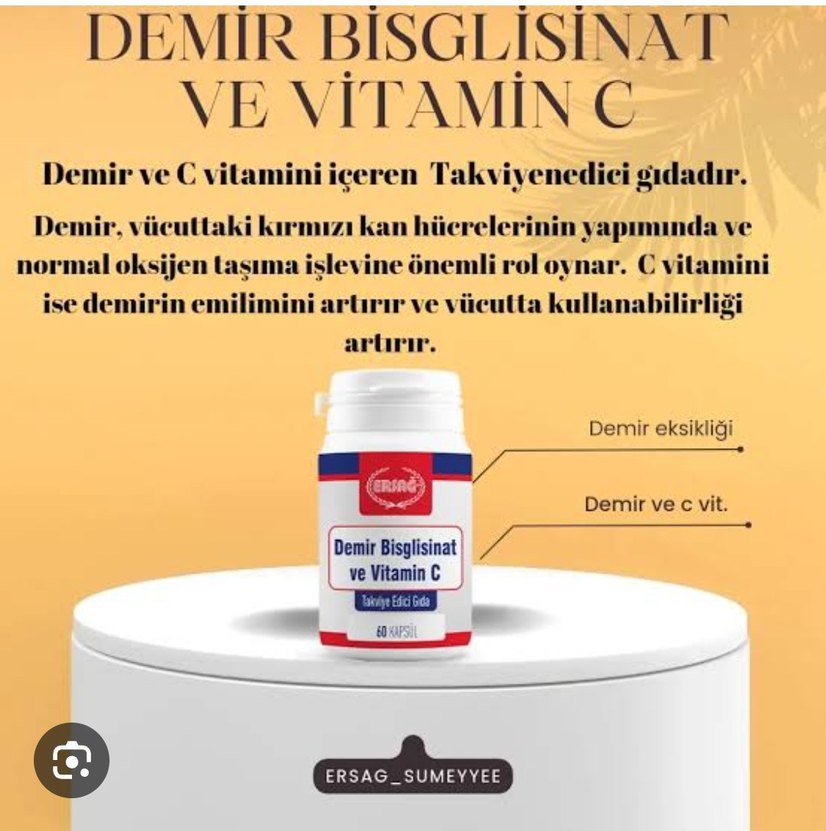 Demir bisglisinat ve C vitamini içeren takviye edici gıda, kırmızı kan hücrelerinin yapımını ve oksijen taşımasını destekler. Demir emilimini artırır. #ersağ #ersağarganyağlışampuan #ersağpropolislişampuan #ersağşampuan #ersağaleoveralışampuan #ersag #bitkiselşampuan #yerliürün #ersağbioşampuan #ersağsaçtoniği