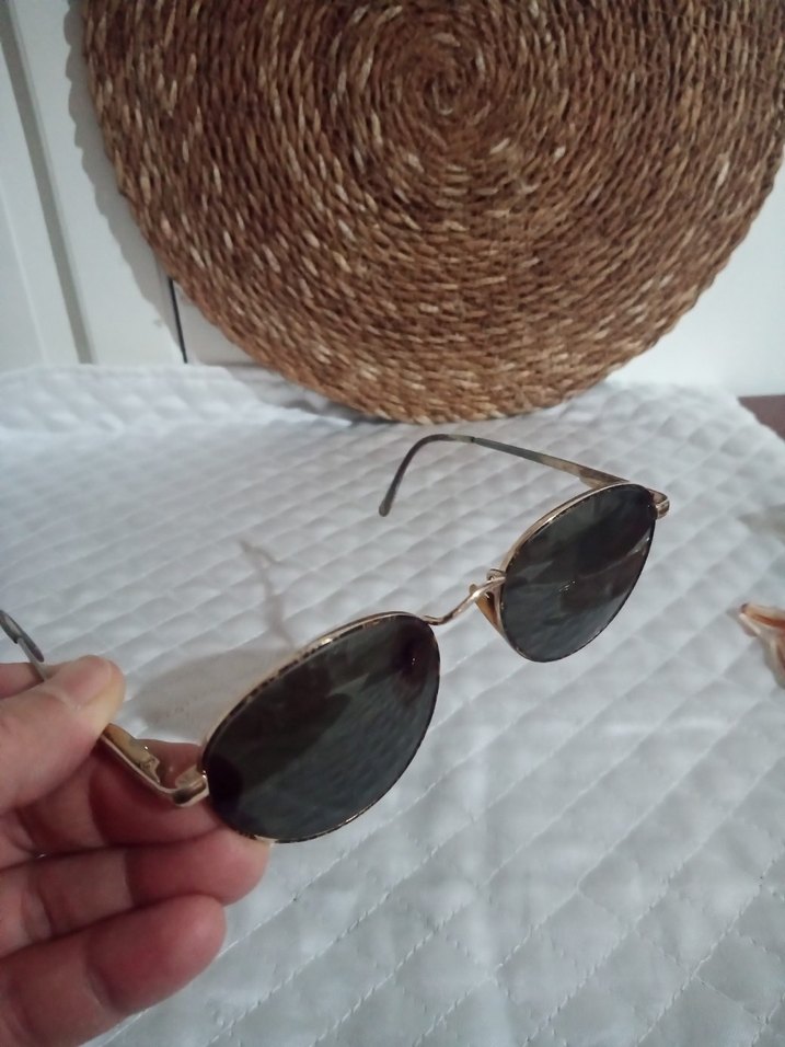 Parlak altın renkli, siyah güneş gözlüğü. ihtiyaç fazlası olduğu için uygulamadadır. Sapında az genişleme vardır. Kullanmaya engel başka bir deformesi yoktur.Klasik yuvarlak camlarıyla bohem ve retro tarzlara uygundur. Ölçü isteyebilirsinizAlana hayırlı uğurlu olsun ✨✨