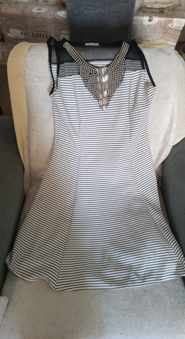 Siyah demir işlemeli , beyaz ve gri çizgili, uzun ve kolsuz, tekne yaka, vücuda oturan elbise. Yumuşak sentetik kumaştan.