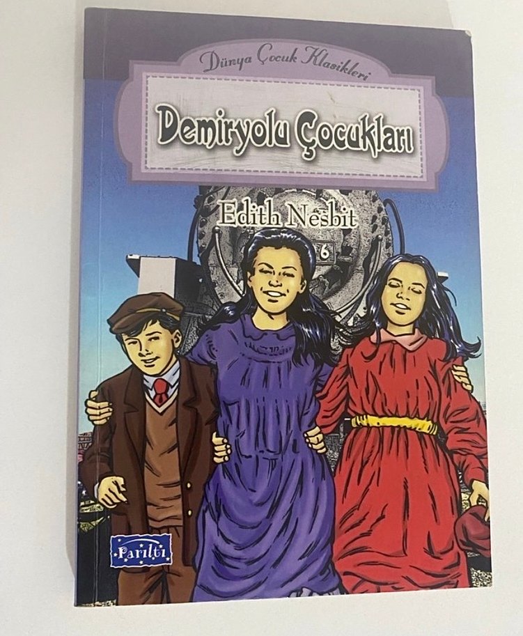 Edith Nesbit'in Demiryolu Çocukları adlı biyografi kitabı, kapakta üç çocuğun maceralarını konu alır.