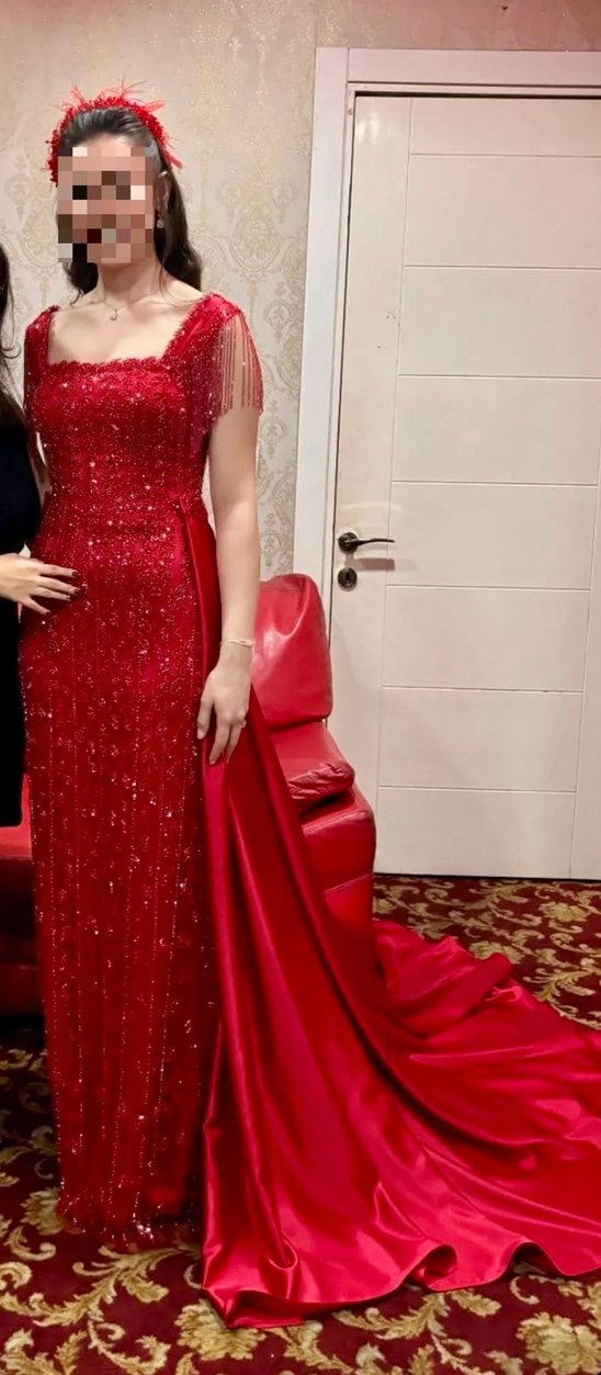 Özel tasarımdır sadece birkaç saat kına gecemde giyildi. Elbise tam kalıp komple boncuk taş işlemelidir. Kolları da sarkan boncuklardan oluşmakta olup dilerseniz kare yaka dilerseniz kolu omuzdan düşürüp straplez kullanabilirsiniz. Elbisenin Demonte eteği yumuşak saten olup kıyafetten çıkarılabilmektedir. Etek elbise birleşimi boncuk işlemeli kemerdir. Fotoğrafta boy topuklu ayakkabı ile 1.80 olup tadilat ile boyunuza uygun hale getirebilirsiniz. Elbisenin sırtı bağlamalı olduğundan her kiloya uygundur.
