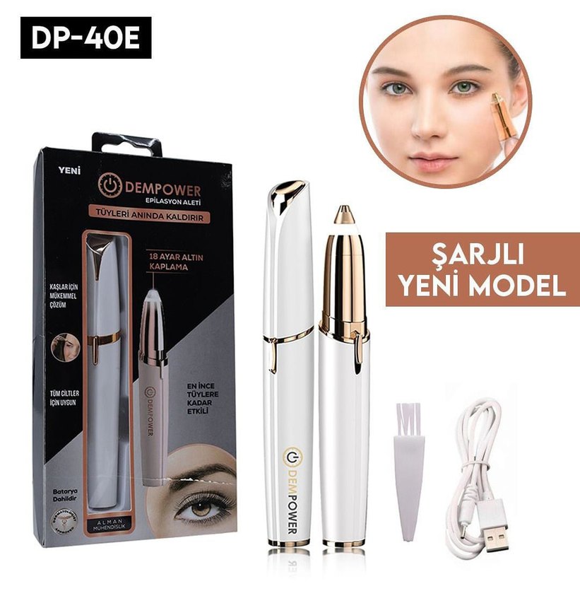 Dempower şarjlı beyaz kaş ve bıyık lazeri. Tüyleri etkili şekilde alır. Temizleme fırçası ve USB şarj kablosu dahildir. ⚡