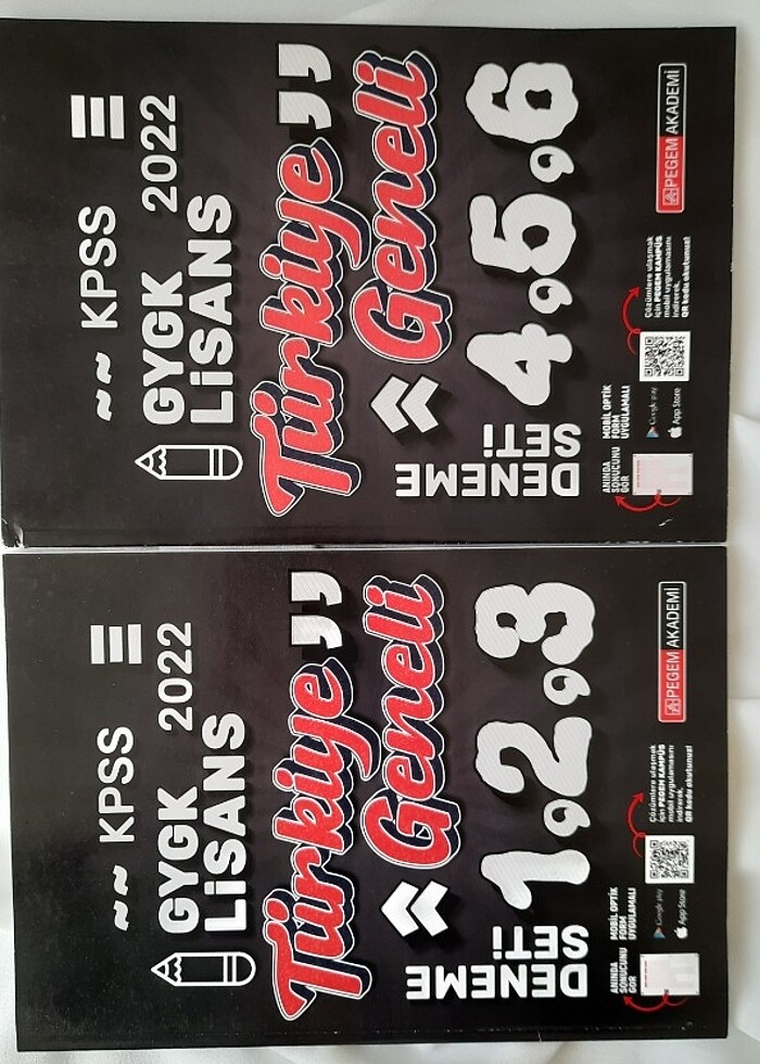 Pegem yayınları Genel Yetenek Genel Kültür Türkiye Geneli 6 adet deneme. Her bir denemenin optik formu mevcuttur. Uygulamadan Qr kodunu okutarak çözümlere ulaşabilirsiniz.