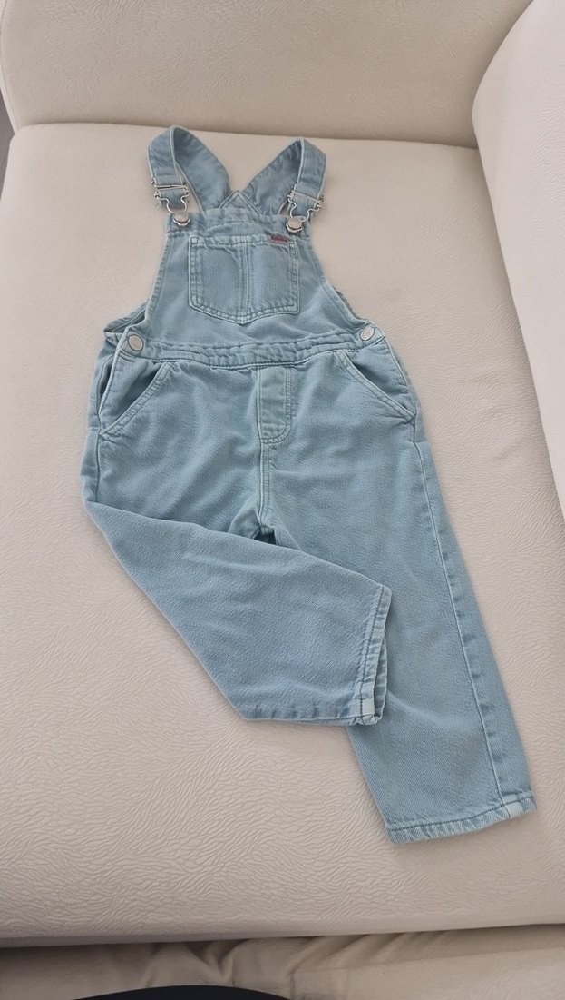 Denim askılı tulum. Ayarlanabilir tokalı askılar ve ön cep bulunur. Pastel ton, sokak stili için uygun.