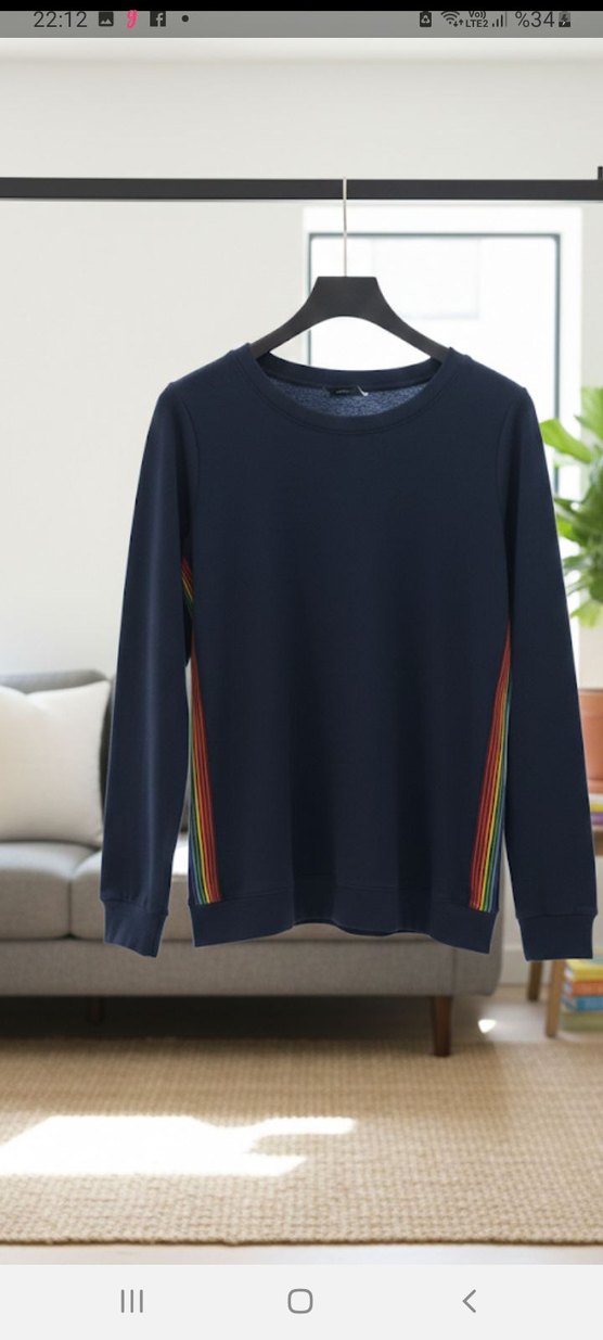 Marka: Denim & Co. (Dünyaca ünlü QVC markasıdır) Durum: Ürün sıfırdır, hiç kullanılmamıştır. Sadece satış etiketi yoktur, tüm iç ve yıkama talimatı etiketleri üzerindedir. Beden: 38 (M beden ile uyumlu, rahat kesim) Ürün Özellikleri: Kumaş İçeriği: %50 Viskon, %46 Polyester, %4 Elastan karışımıyla çok yumuşak, nefes alan ve esnek bir dokuya sahiptir. Tasarım: Derin lacivert renk üzerine, her iki yanda canlı renklerden oluşan gökkuşağı şerit detayları mevcuttur. Kullanım: Bisiklet yakalı, uzun kollu ve günlük kullanım için son derece konforlu bir modeldir. Bakım: 30 derecede hassas yıkamaya uygundur. Yumuşak dokusu sayesinde hem evde hem dışarıda spor-şık kombinler için ideal bir parçadır. Alıcısına şimdiden hayırlı olsun