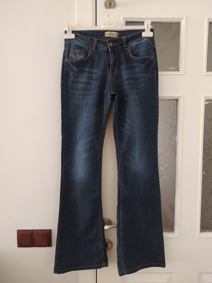 Kadınlar için normal boy, parlak mavi renkte, kemerli detaylı denim jean pantolon. Rahat kesimiyle günlük sokak stiline uygun.