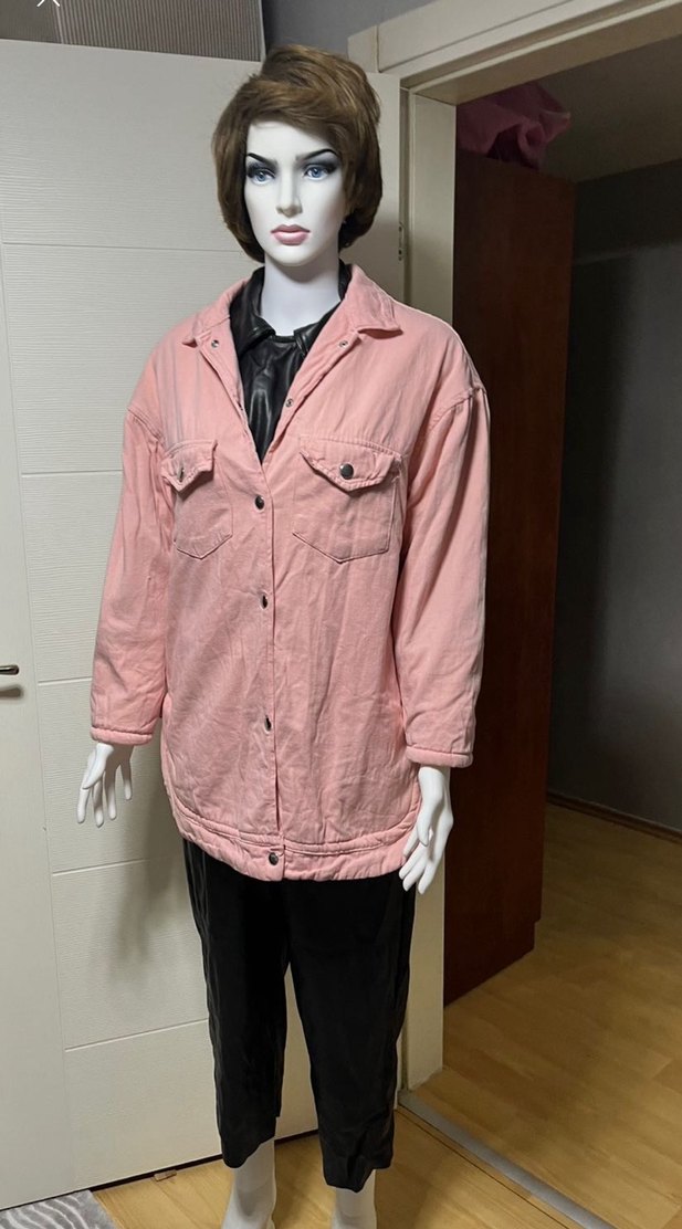 Pembe renkte, düğmeli ve kesik yakalı kadın denim ceket. Rahat kesim, uzun kollu ve midi boyda, yumuşak keten kumaştan üretilmiştir. İki göğüs cebi bulunur.