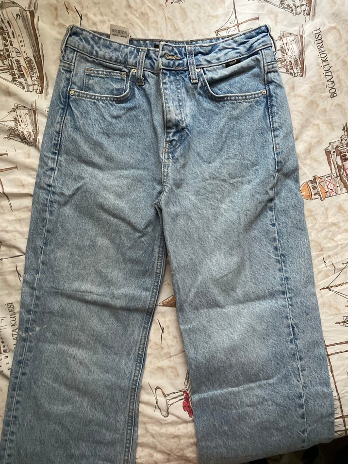 düğmeli ve bol kesim kadın jean. Denim kumaştan, günlük sokak stili için uygun. Mavi marka