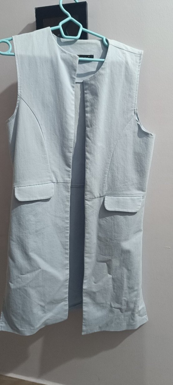 denim kumaştan, yakası kesik ve cepli, salaş kesim kadın yelek. Günlük sokak stili için uygundur. marka temsili