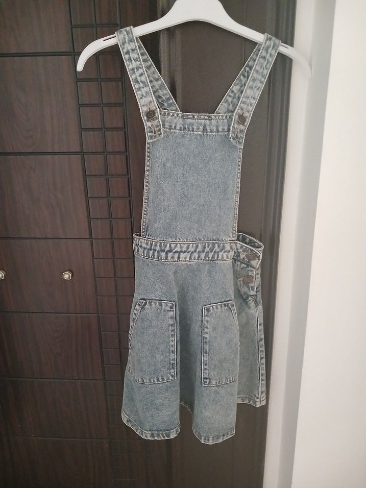 çocujlar için bol kesim, denim kısa salopet. Tokalı askılar ve büyük ön cepler bulunur. Sokak stiline uygun.iki kere giyildi sıfır ayarında
