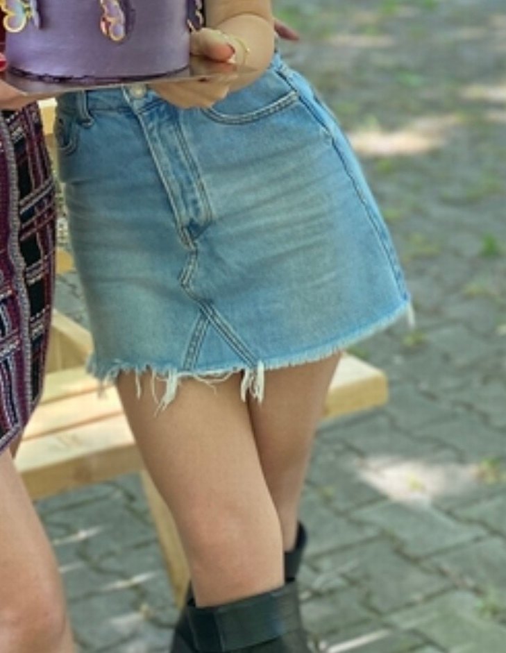 mavi renkli, yırtık uçlu denim mini etek. Günlük kullanıma uygun, trend bir tasarıma sahiptir.