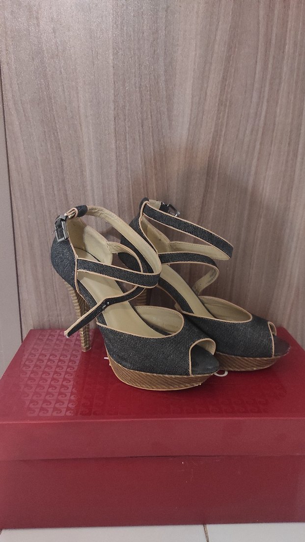 Gri denim malzemeden yapılmış, tokalı ve baskılı desenli yüksek topuklu kadın ayakkabısı. Romantik akşamlar için modern Paris tarzı. topugunda deforme vardı ojeyle boyadı mgorselde mevcut
