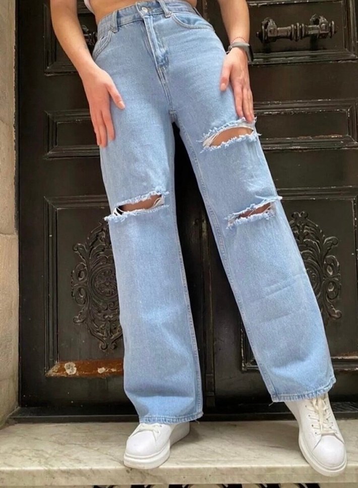 Gevşek kesim, mavi denim kot pantolon, yırtık detaylı tasarıma sahip. #wideleg #kadın #jean #denim #yırtık