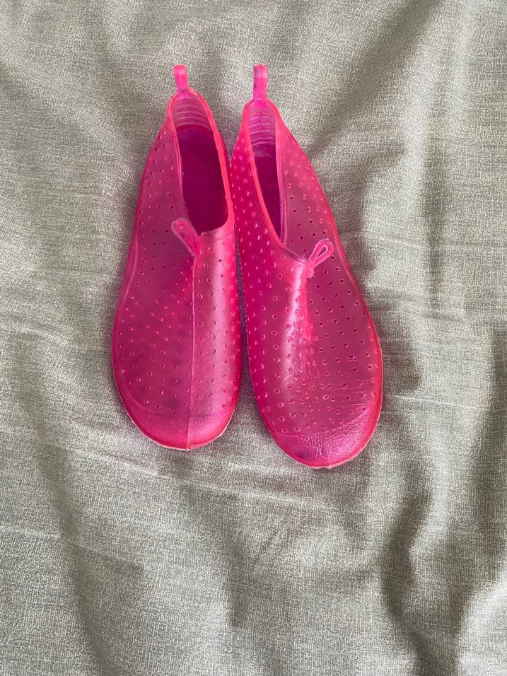 Şeffaf pembe renkte, esnek kauçuk malzemeden yapılmış, desensiz ve çağdaş tarzda deniz ayakkabısı. Canlı renklerle trend bir görünüm sunar.