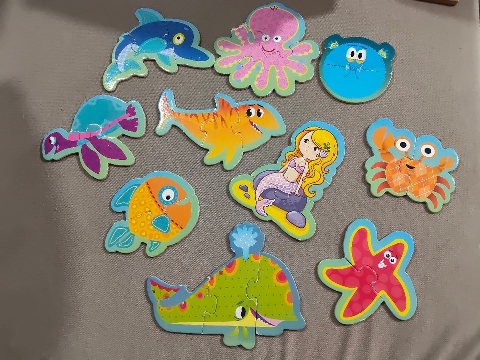 Renkli deniz canlıları figürleri içeren çocuk puzzle'ı, farklı şekillerle çocukların ilgisini çeker. parçaları tamdır kutusunu atmışım ,biyranmamyırtılma var ama yapıştırmışız.fiystı cok makul koyuyorum