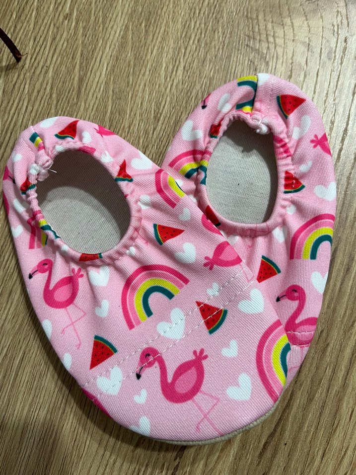 Pembe zemin üzerinde flamingo, gökkuşağı, kalp ve karpuz desenleri bulunan renkli bebek çorabı Elastik ağız kısmı ile rahat kullanım sağlar. 21 numaradır