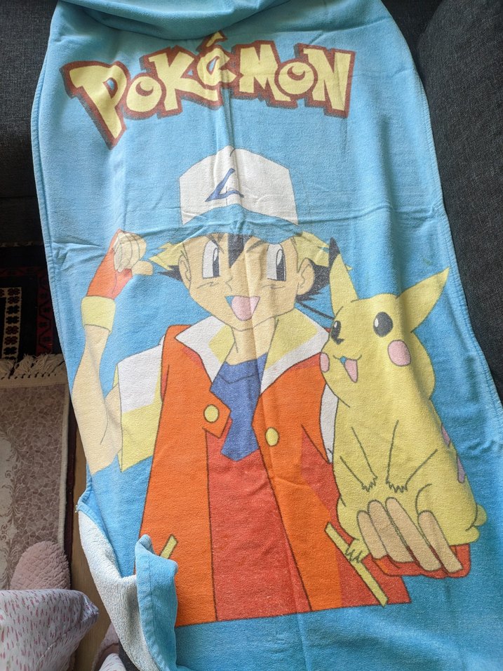 Renkli Pokémon baskılı, yumuşak mavi kumaştan erkek çocuk deniz havlusu