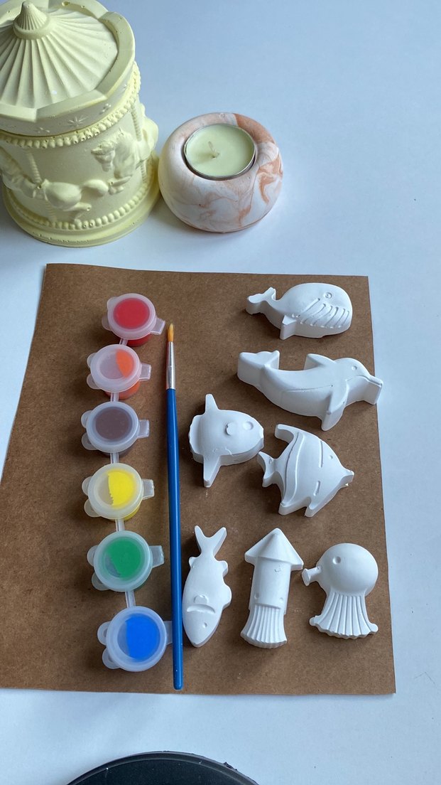 Deniz hayvanı figürleri, altı renkli küçük boya kabı ve ince bir fırçadan oluşan boyama seti.