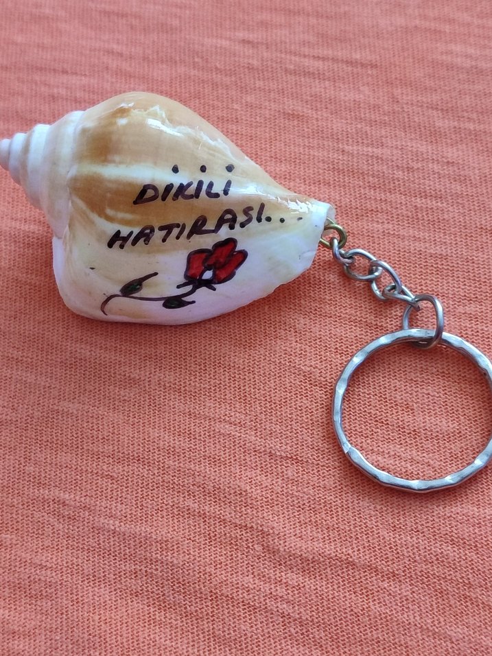 Üzerinde "Dikili Hatırası" yazısı ve kırmızı çiçek çizimi bulunan deniz kabuğundan yapılmış renkli anahtarlık. Zincir detayı vardır, bohem ve retro tarzına uygundur.