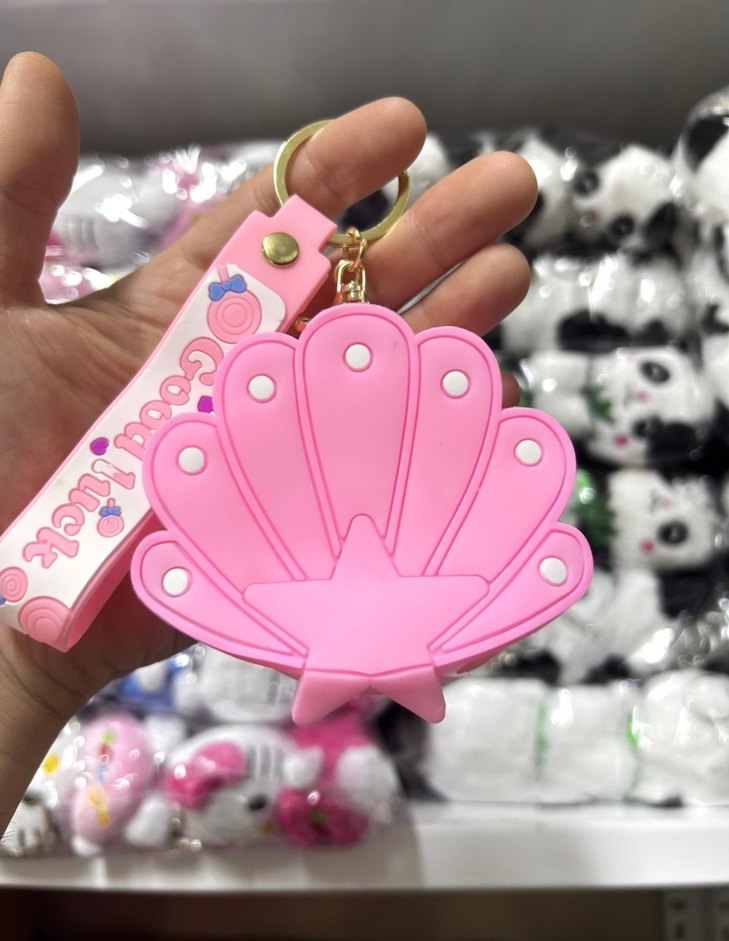 Pastel pembe renkte, deniz kabuğu şeklinde ve yıldız detaylı anahtarlık, püsküllü kayışıyla bohem ve göz alıcı tarzı yansıtıyor.