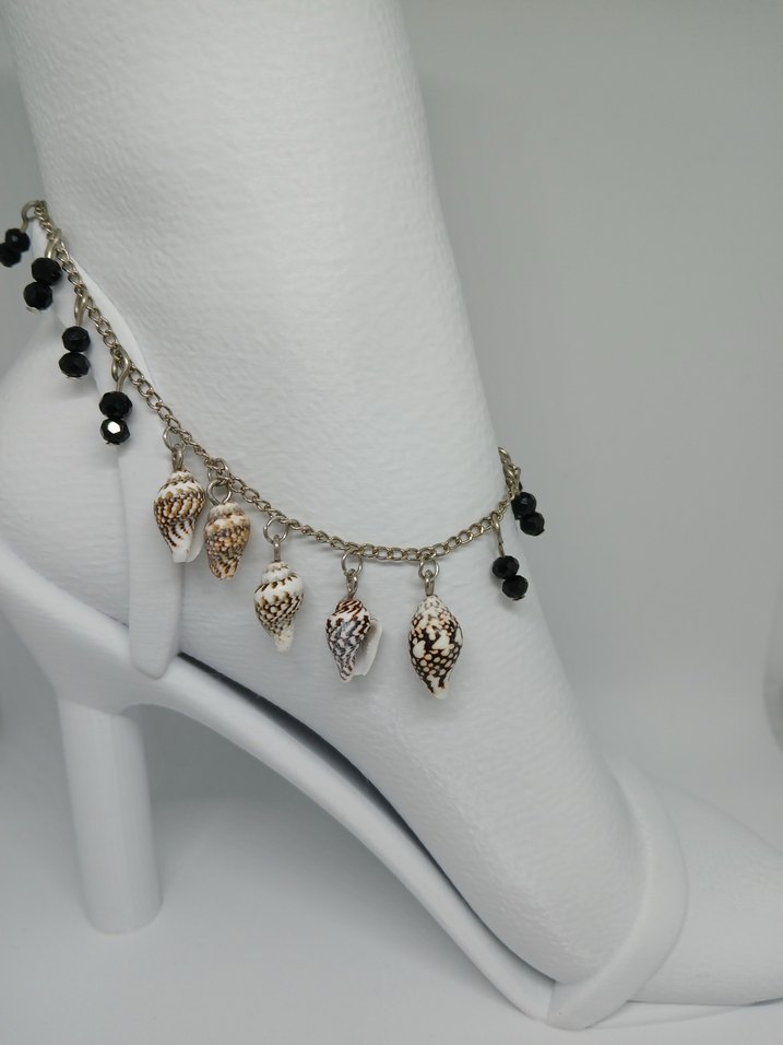 Altın renkli zincir detaylı bu halhal, deniz kabuk figürleri ve siyah boncuklarla bohem ve retro tarzını yansıtıyor.