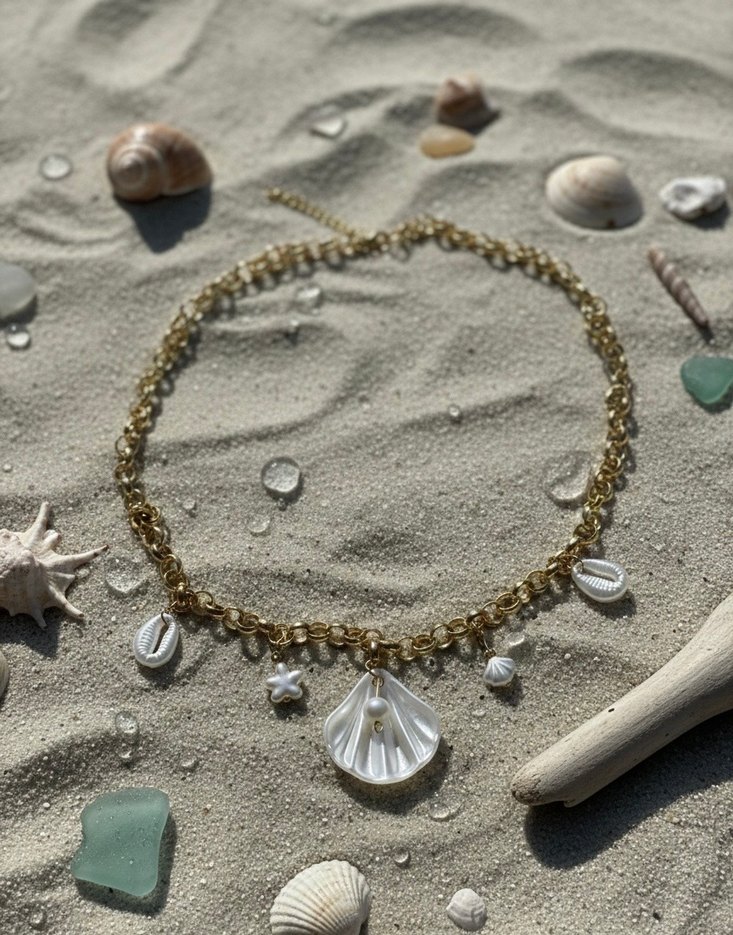 Altın rengi zincir kolyenin üzerinde deniz kabuğu detayları bulunmaktadır. Yaz aylarında kombinlerinize farklı bir hava katacak.