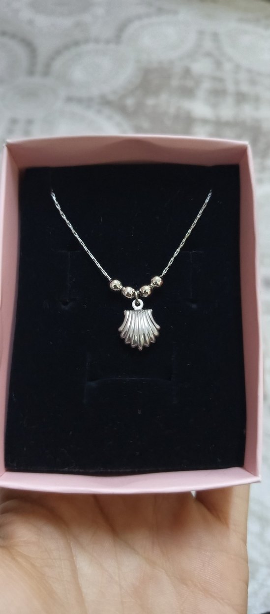 Parlak silver renkli, kısa boncuklu zincir ve küçük deniz kabuğu kolye ucu içeren şık kolye. Romantik akşamlar için uygun. celik
