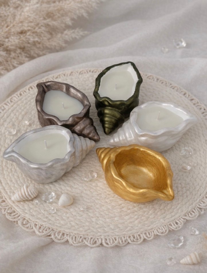 Beyaz, altın, gümüş, bronz ve zeytin yeşili renklerde deniz kabuğu şeklinde mumluk seti, her biri beyaz mum içerir. Yuzde yuz soya wax kullanilir. Esans ve renk secenekleri mevcuttur