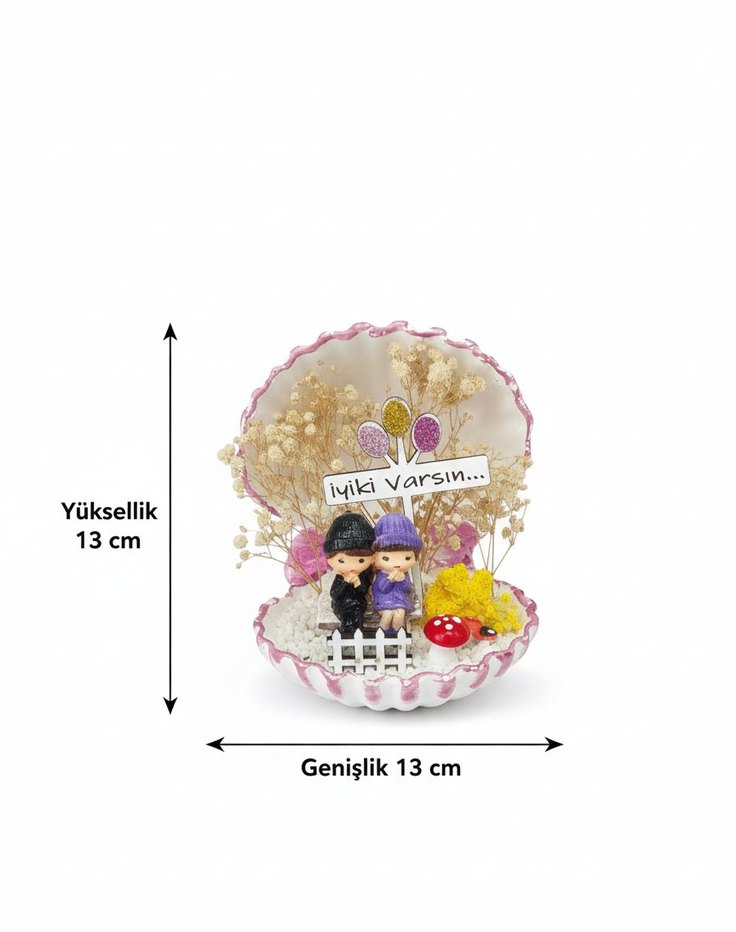 Bu sevimli ve anlamlı biblo, sevdiklerinize "İyi ki varsın" demenin en zarif yollarından biri. Hem dekoratif şıklığı hem de duygusal mesajıyla öne çıkan bu tasarım, özel günlerde unutulmaz bir hediye seçeneği sunuyor. Ürün Özellikleri ve Detaylar Bu özel tasarım objesi, bir deniz kabuğu formunun içinde küçük bir yaşam alanı sunar. İşte bu ürünü özel kılan detaylar: Duygusal Mesaj: Üzerinde yer alan "İyiki Varsın..." yazılı tabela ile sevginizi en saf haliyle ifade eder. Sevimli Figürler: El ele tutuşan, kalp figürlü romantik çift figürü ile aşkı ve bağlılığı simgeler. Estetik Tasarım: Canlı kırmızı kurutulmuş çiçekler (gelin nefesi), renkli balonlar ve minyatür mantar figürleriyle zenginleştirilmiştir. İnce İşçilik: Deniz kabuğu tabanı ve küçük beyaz çit detayıyla masalsı bir atmosfer yaratır. Kullanım Alanı: Ofis masası, kitaplık, gece lambası yanı veya TV ünitesi gibi her türlü alanda dekoratif bir dokunuş sağlar. Ürün Ebatları görselde mevcuttur