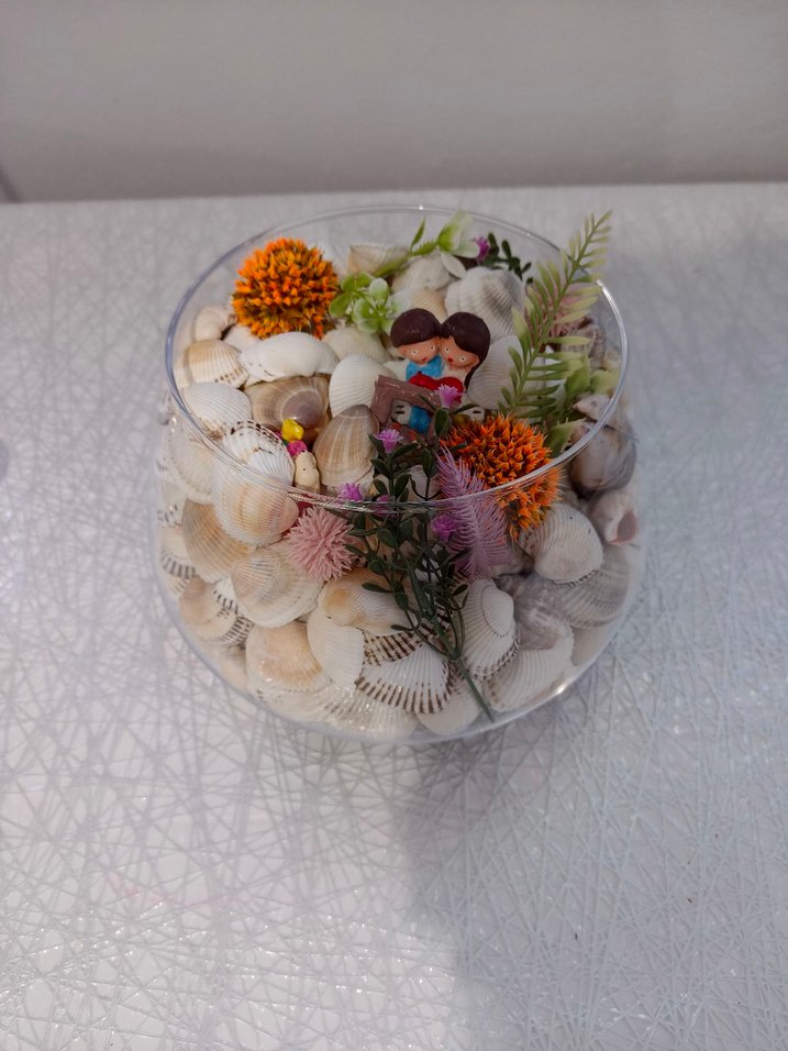 Hafif renkli deniz kabukları ve canlı çiçeklerle dolu, minyatür çift figürlü dekoratif kase, ev dekoruna doğal bir dokunuş katar.