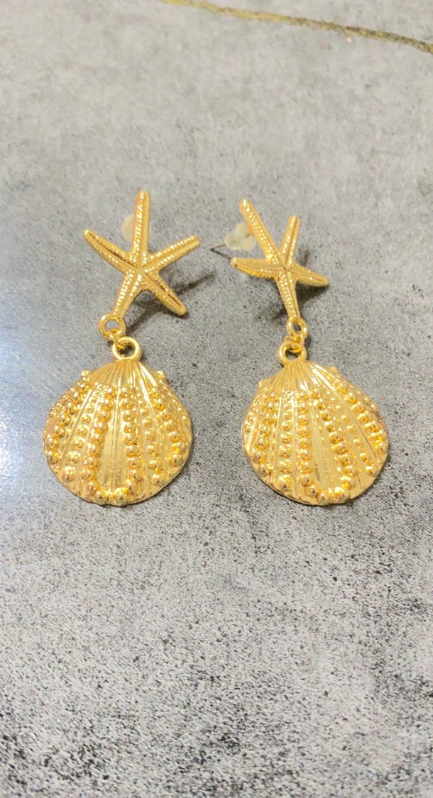 Parlak altın renkli, deniz kabuğu ve denizyıldızı işlemeli küpelerdir. Plajda şık görünüm sağlar.