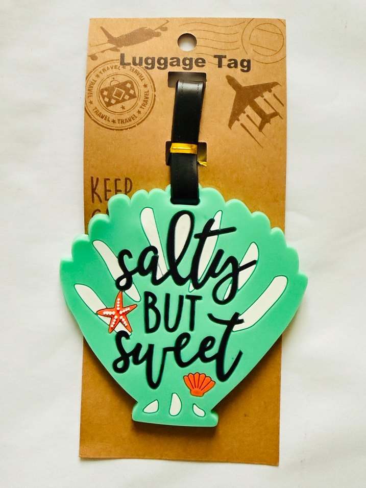 deniz kabuğu şeklinde renkli detaylı bavul etiketi, üzerinde 'salty BUT sweet' yazısı bulunur.