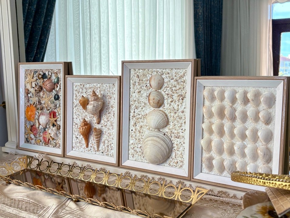 Doğal deniz kabuklarının dokulu zemin üzerinde yer aldığı beyaz çerçeve seti, mekana sahil esintisi katıyor. Kendi el emeğimin ürünüdür.