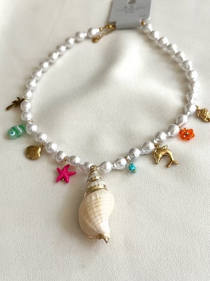 Kısa uzunlukta beyaz boncuklardan oluşan, ortasında deniz kabuğu ve renkli küçük figürlerle süslenmiş bohem tarz kolye. Plaj için uygun.