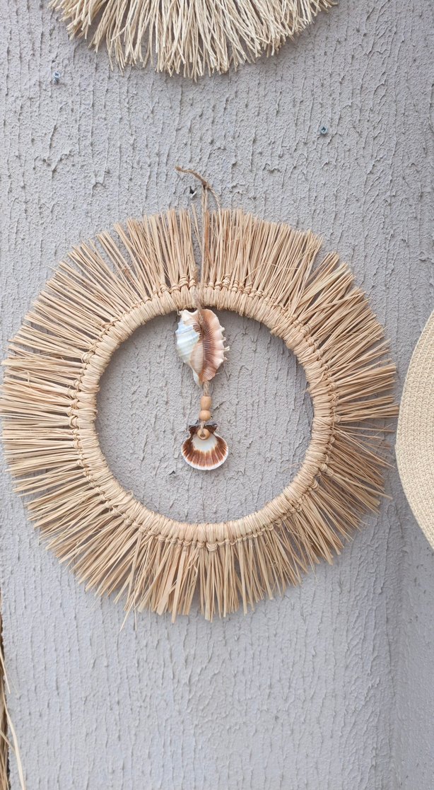 Deniz kabuklarıyla süslenmiş doğal hasır çerçeveli yuvarlak duvar aynası, sahil veya rustik dekor için uygun .