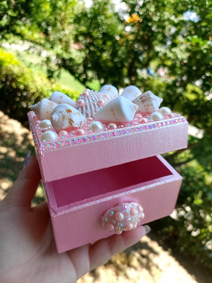 Kendi tasarımımdır.Pastel pembe takı kutusu kapağında gerçek deniz kabukları ve incilerle süslenmiştir.10*10*7cm.