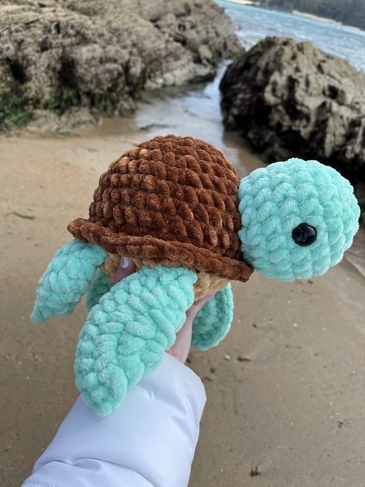 Kahverengi kabuk ve pastel mavi uzuvları olan, kalın dokulu yumuşak peluş deniz kaplumbağası oyuncak. Boyu 20 cm