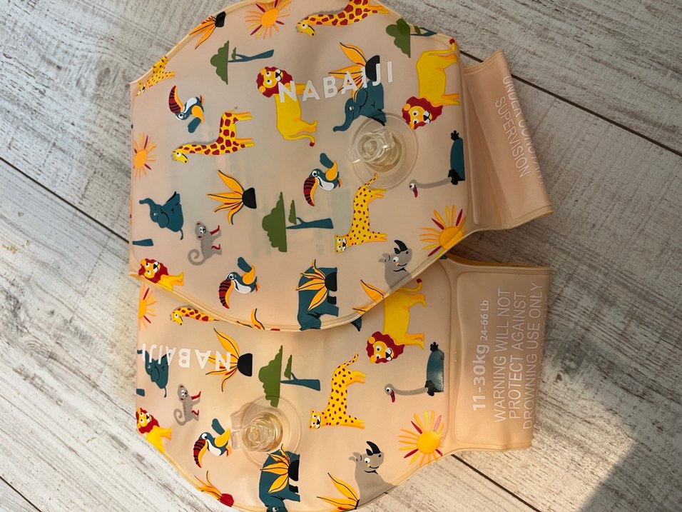 Hayvan desenli, plastikten yapılmış renkli şişme kolluk. 11-30 kg arası çocuklar için uygundur, güvenlik uyarıları içerir.