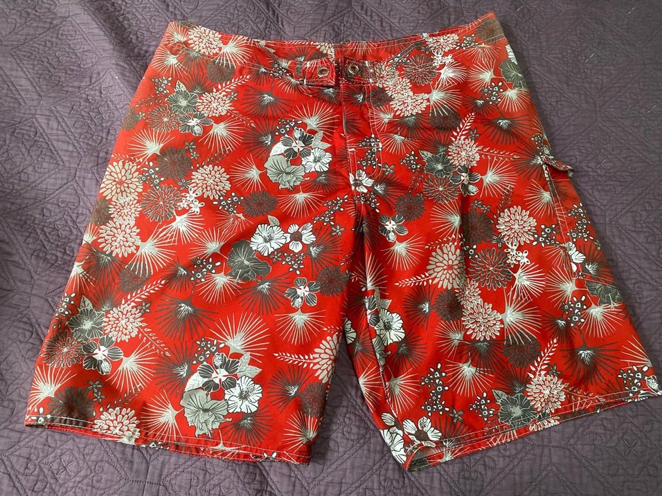 kırmızı canlı çiçek desenli, normal boy, bohem tarzda erkek mayo şortu. İade kabul etmiyorum