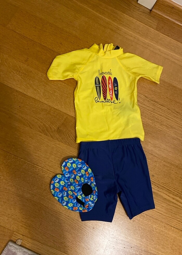 1-2 yaş arası bebek deniz mayo takım alt ve üst Deniz ayakkabısı ile birlikte. İngiltere’den alınma. Güneş koruması içerir.