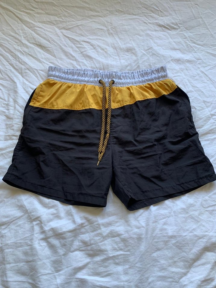 Sarı ve siyah renk bloklu, bel detaylı, bol kesim erkek şort. Plajda kullanıma uygun, streetwear tarzında. sorunsuz