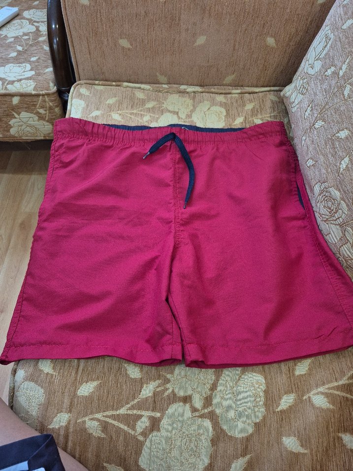 bordo renkte, sentetik kumaştan üretilmiş, rahat kesim Deniz şortu Plaj için uygun, sade ve renkli tasarıma sahip.