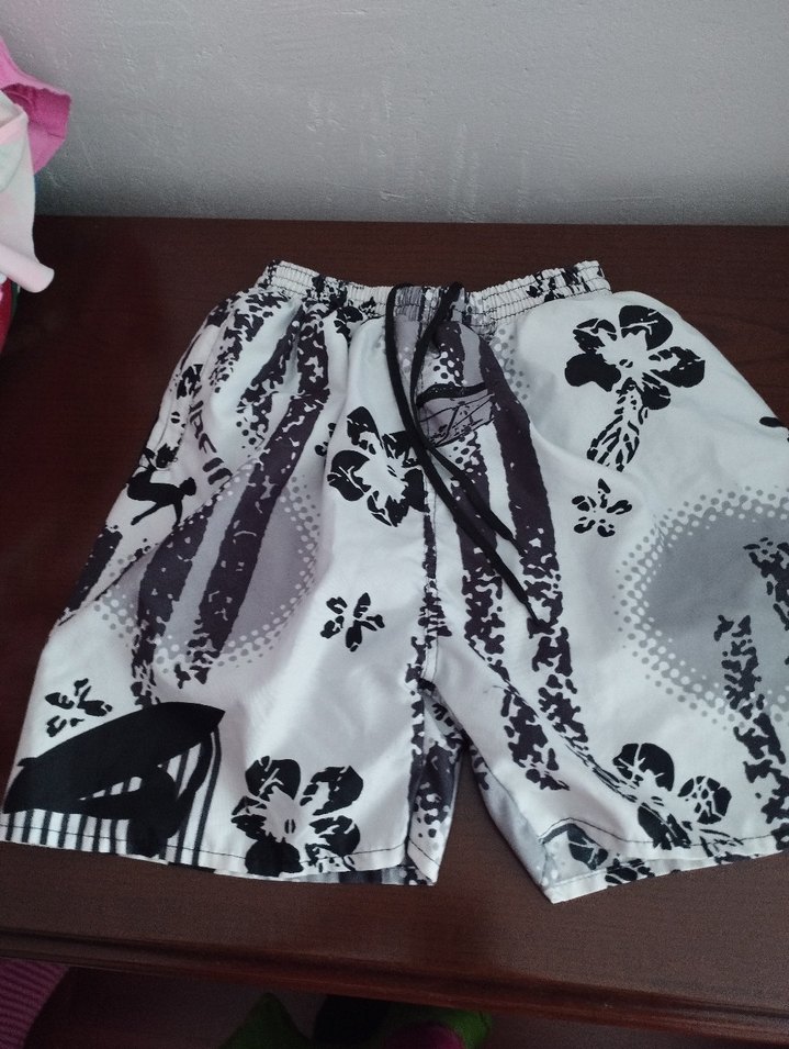Gri ve beyaz renklerde, baskılı ve bol kesim erkek deniz şortu az kullanılmış 7 8 yaşlara uyumlu